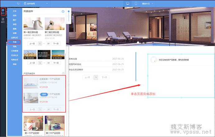 4、进入到设计页面,点击 组件 >> 列表 >> 产品列表控件,在页面上单击,即可添加一个产品列表。
