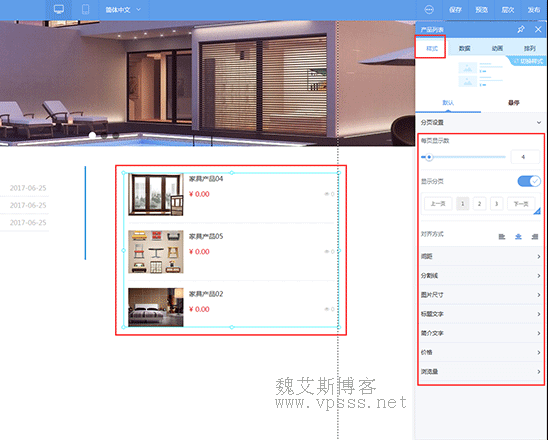 6、在属性栏 样式 里可设置每页显示数量、间距、图片大小、标题设置、简介文字、价格显示等