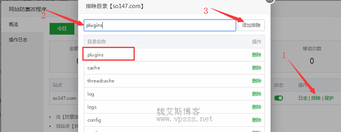 2、如果不想每次都去停掉网站防篡改程序,第二个办法是在网站防篡改程序中点击“排除”,在空格中添加文件夹名字plugins,或者文件夹的绝对路径,比如 /www/wwwroot/vpsss.net/wp-content/plugins/,效果都是相同的。这样就可以在防篡改控制时避开这些文件夹,不进行保护。