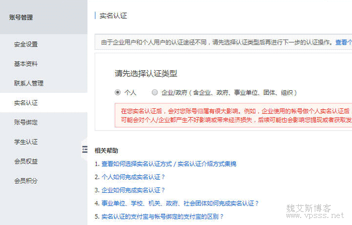 1、点我登陆阿里云控制台,点击会员名进入账号管理,在左侧导航栏点击实名认证,选择认证类型为个人,点击确定。