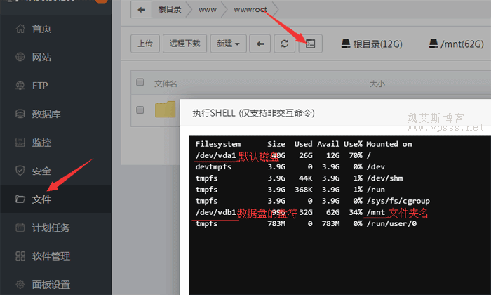 当时老魏手里又没有 SSH 账号密码,第一种方法用宝塔的文件功能手动添加挂载命令到 /etc/fstab 文件(去宝塔面板 >> 文件 >> 找到这个文件并编辑)中: