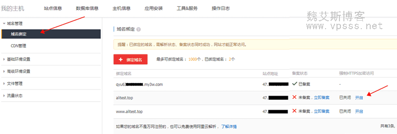 1、上面说到了这位朋友的服务器情况,阿里云虚拟主机支持 SSL证书(仅限 linux系统),登陆到阿里云虚拟主机管理后台,在域名管理 >> 域名绑定中找到要开启 SSL的域名,看到右侧强制 https加密访问,点击下面的开启。这里注意主域名和 www域名都要开启。