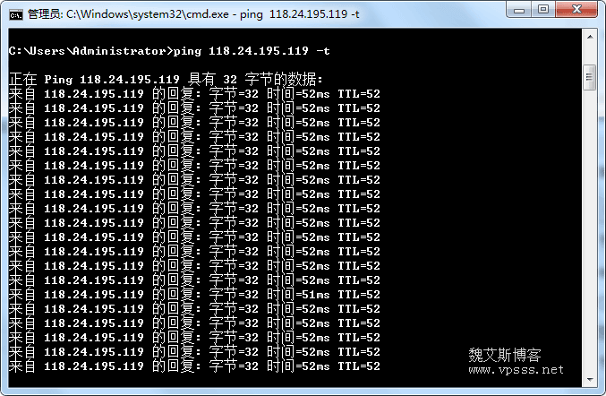 下面截图是老魏从本地 ping 腾讯云重庆服务器节点的结果。持续稳定在 52ms,老魏地处北方使用百兆联通光纤宽带。要想知道云南 ping 腾讯云节点的真实数值,就得自己用本地宽带去测试一下,老魏的数字只是一个参考。