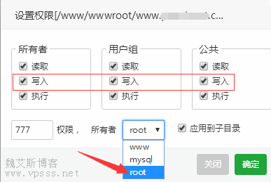他选择的所有者是 www ,即使勾选了全部可写入,也仍然会出现“不可写”的提示。老魏给所有者改成 root,并把上面的几项“写入”都勾选后,权限777,确定。