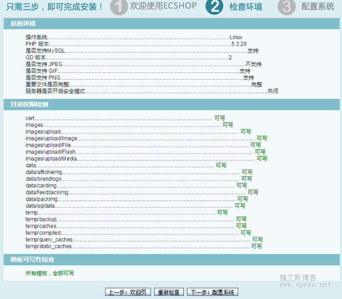 这时再去运行 ECShop安装程序就没有“不可写”的提示了,顺利安装完成。