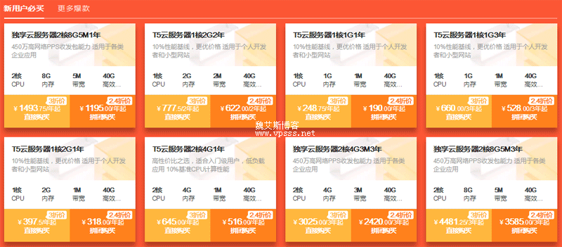 | T5云服务器1核2G 1年 | T5云服务器2核4G 1年 | 独享云服务器 2核4G3M 3年 | 独享云服务器 2核8G5M 3年 |