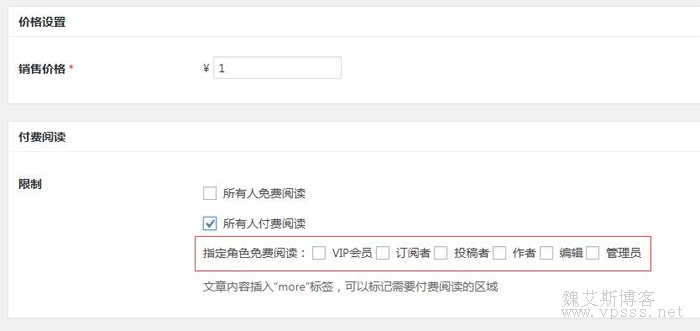 下面设置付费阅读文章的角色权限,指定哪个角色可以免费阅读,这样就可以设置 VIP会员无限制阅读了。