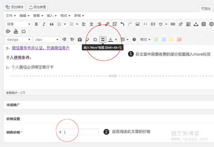 在发表文章时,在文章中需要收费的部分前面插入 More标签,最下面输入销售价格。