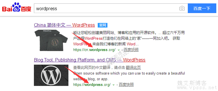 国内一般去度娘搜索 wordpress 即可。搜索结果如下,会有很多广告推送。我们只要记住两个 wordpress 官方网站,从这上面下载是可用且安全无毒的。