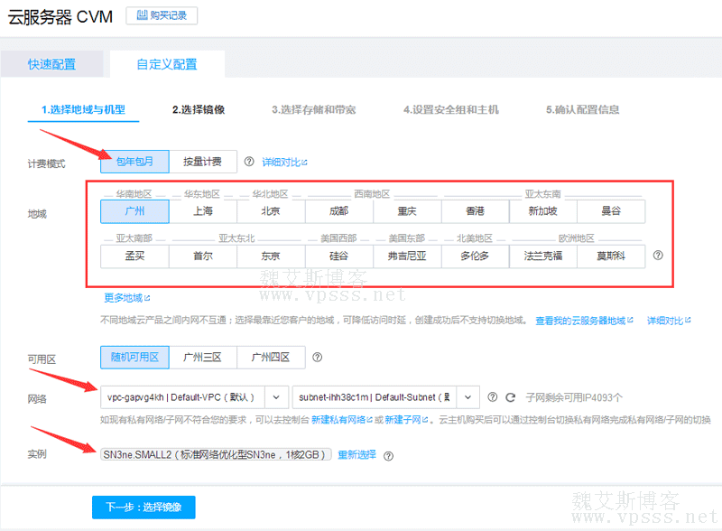 实例:点击选择适合你自己业务需要的主机配置。个人博客、小型网站选择 1核1G,机型标准型 S2实例;企业网站选择 2核4G机型。这里的内容说起来就很复杂了,限于篇幅关系不展开说了。大家不知道怎么选择配置可以加页面右侧的qq群,找老魏聊聊你的需求,我帮助过很多人选择主机配置,会以个人经验提供合适的建议。