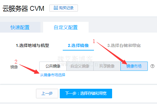 点击“下一步选择镜像”。点击“镜像市场”>> 从镜像市场选择。
