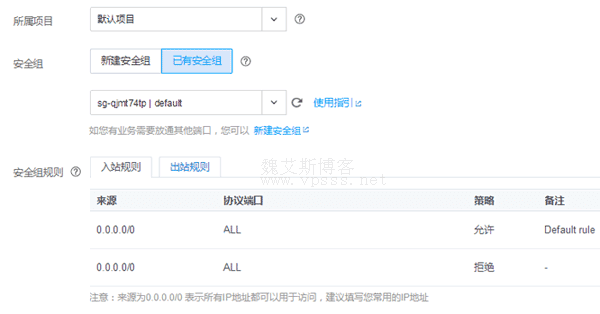 安全组选择 default 就行。后期根据业务实际需要手动调整相应端口。详情参考新购腾讯云主机安全组未放行导致网站、数据库无法访问;