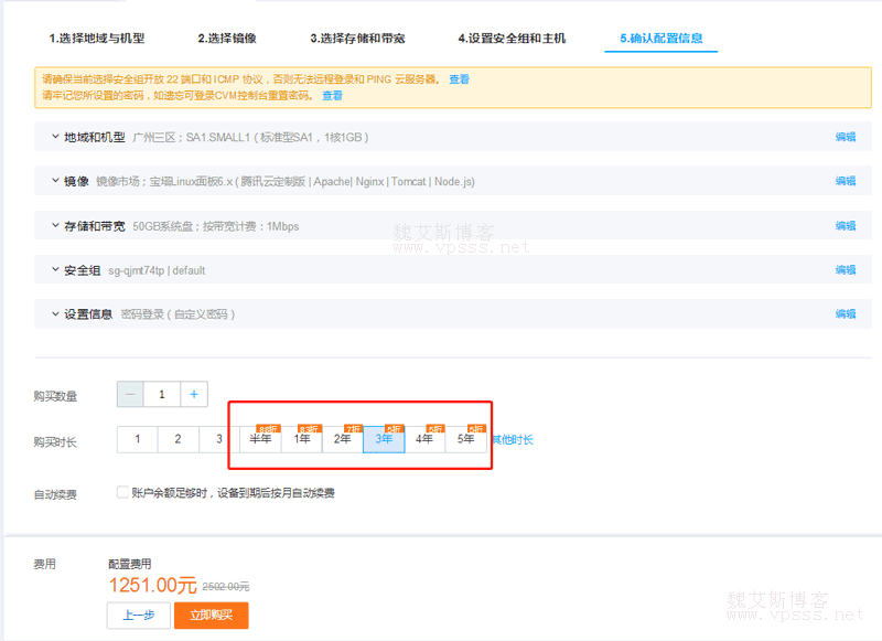 购买时长:1年 83折,3年以上 5折。时长越久优惠力度越大。如果业务打算长期运营,老魏建议一次性买3年以上。