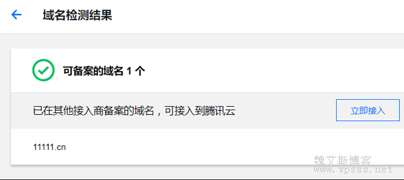 在域名检测结果页面,如果域名可进行接入备案,则立即接入。