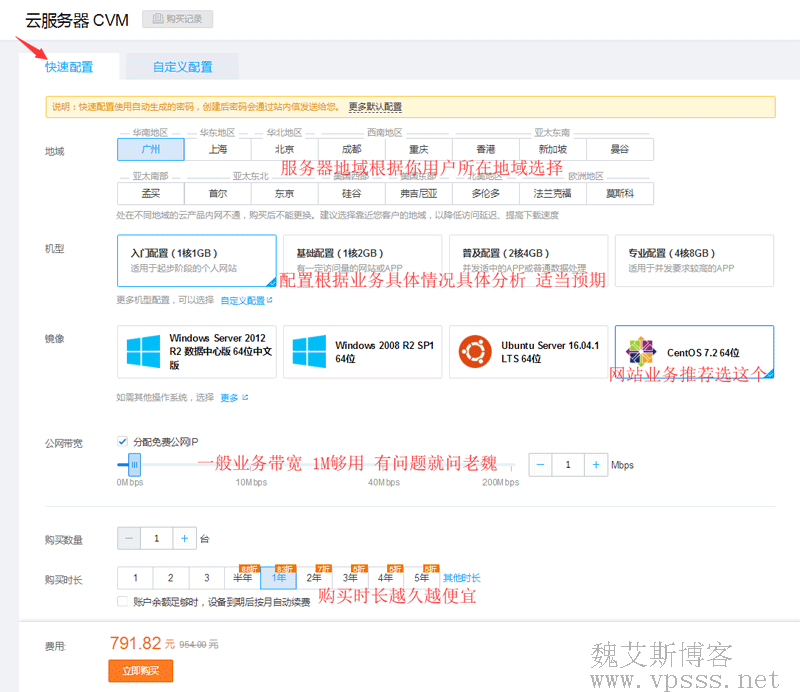 细心的人会看到下图中云服务器 CVM购买页面,有快速配置和自定义配置两种方式。之前老魏写过教程,请移步腾讯云服务器快速配置购买教程,还有腾讯云自定义配置购买云服务器图文操作教程,都可以拿去参考用。