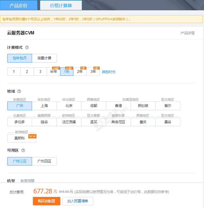 可用区:不同可用区存在价格差别,不同可用区之间产品内网互通。比如广州三区和广州四区价格就有一定差距了。这里按照自己的财力选择吧;