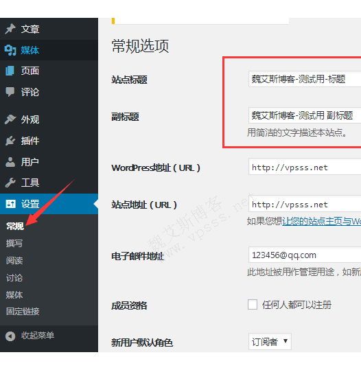 在 wordpress 管理后台的设置 >> 常规中,添加站点标题和副标题。