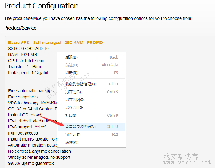 点我直达搬瓦工官网,随便找一个方案点击进入详细配置页面,一定要进入产品配置的页面,别的页面是看不到的。鼠标右键点击空白处,选择“查看网页源代码”。