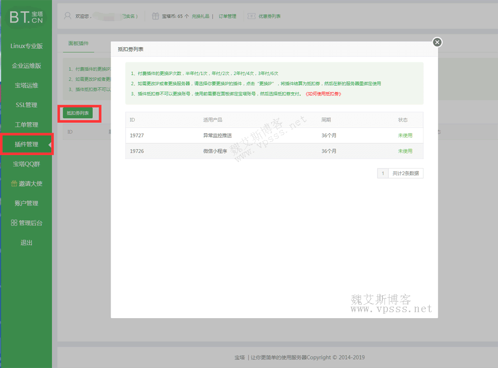宝塔面板插件抵扣券用于在官网购买宝塔面板付费插件的抵用券后,然后在自己使用的宝塔面板上开通付费插件功能使用。为了方便大家快速购买及兑换使用,魏艾斯博客分享插件抵扣券在哪里及如何使用的操作过程。