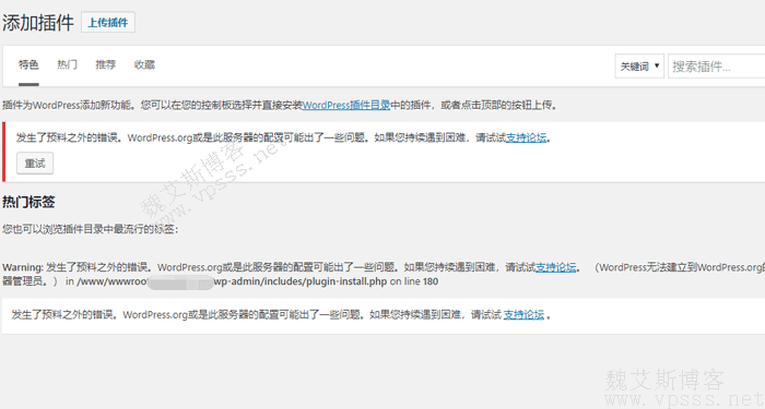 WordPress 发生了预料之外的错误,wordpress 或是此服务器的配置可能出了一些问题。在安装插件的时候遇到这种问题,挺烦人的。之前魏艾斯博客写过wordpress 无法建立到 wordpress org 安全连接的解决办法,那里面的解决办法比较特殊,后来有很多人说照此操作都没有解决。今天老魏分享一个快速解决思路。