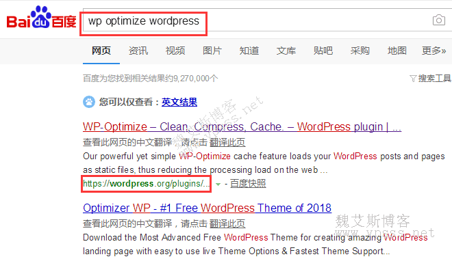 搜索“插件名+wordpress”就能找到插件下载地址。以 wp optimize 插件举个栗子,搜索“wp optimize wordpress”。一般搜索结果第一个就是,注意下面的网址一定是 wordpress org开头的,这才是官方网站。