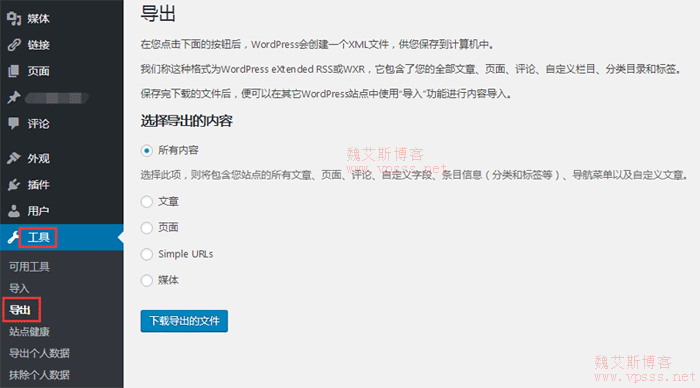 使用WordPress自带导出导入功能备份和恢复网站是早期大家常用的办法,在 wordpress 后台>工具>导出,选择所有内容,下载导出的文件,最后得到的是 XML 文件。恢复网站时使用导入功能恢复网站内容。