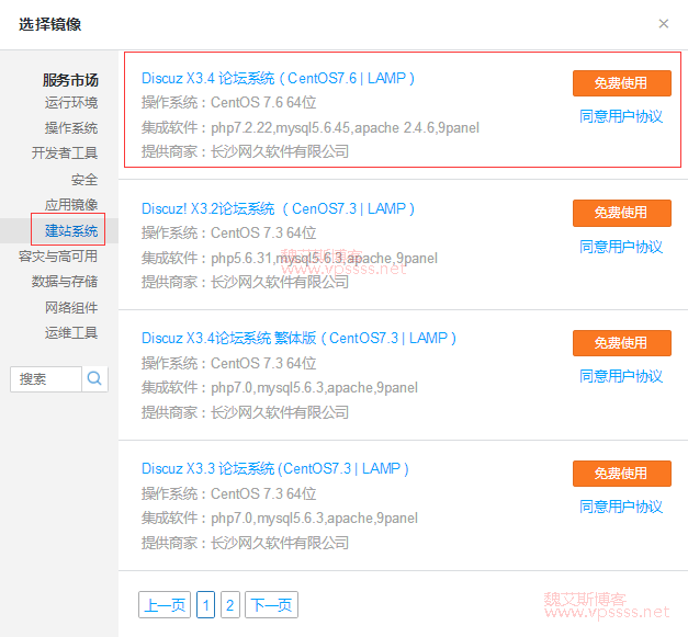 4、选择【建站系统】>【Discuz X3.4 论坛系统】,免费使用。