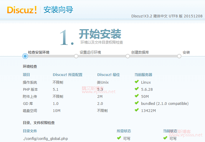 安装程序会自检服务器状态是否符合 Discuz! 的安装条件,像下图中都是绿色对勾就没问题了。