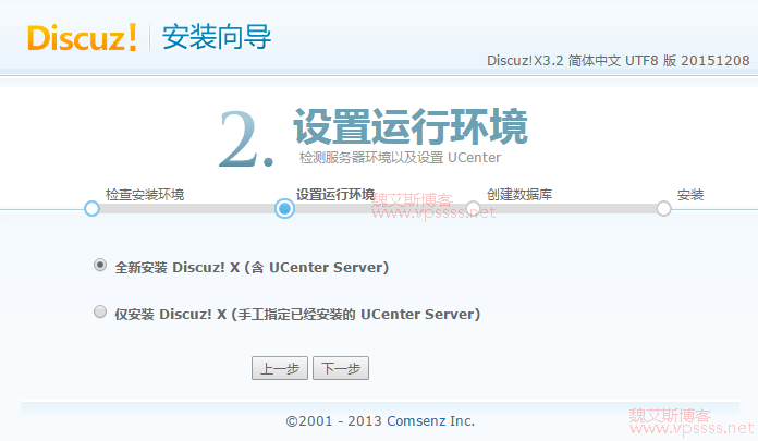 当前状态没问题,点击下一步进入设置运行环境页面,一般都选择全新安装,包含 UCenter Server 程序。