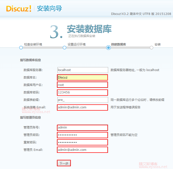 使用镜像默认的 MySQL 帐号和密码(默认为 root/123456)连接数据库。并设置好系统信箱、管理员帐号、密码和 Email。管理员账号密码就是以后用来登陆 Discuz! 论坛管理后台用的,所以要记录下来备用。