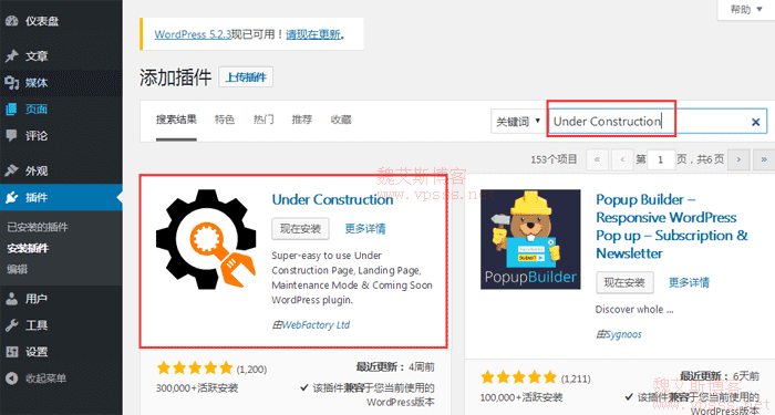 这个插件的免费功能部分也足够我们用了。在 wordpress >> 插件 >> 搜索栏输入 Under Construction,稍等会看到下图的插件,看看版本更新的还蛮频繁的,安装并启用。