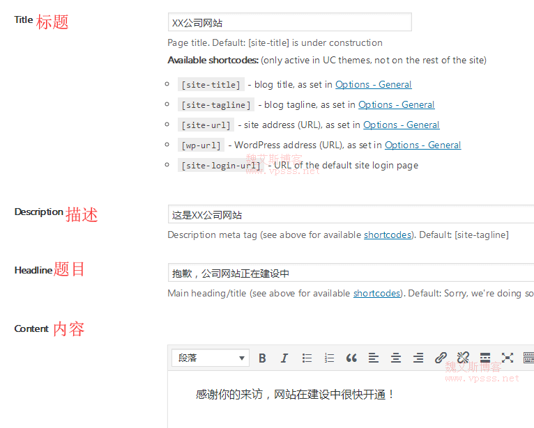 群友 @obai 手里的域名闲置快2年了,想暂时先挂张图片显示着。请问下有没有一种主题,就只显示一个图片的。大家都提到了 Under Construction插件很好用吗,可以一分钟显示出效果来。魏艾斯博客研究了一下觉得蛮好用,也记录分享出来。
