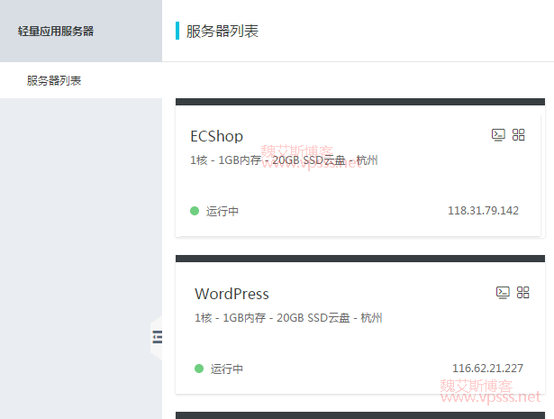 购买并创建服务器后,点击服务器列表中的ECShop轻量应用服务器