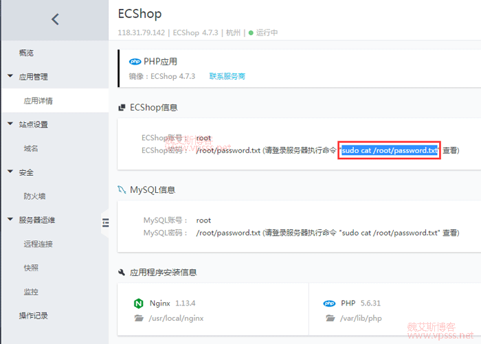 点击应用管理 >应用详情,复制 ECShop 查看命令。