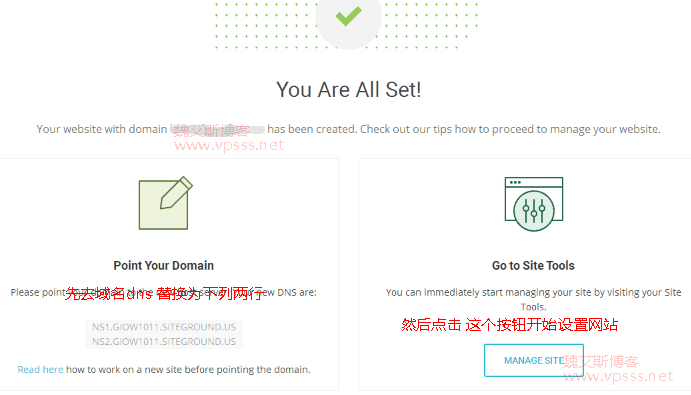 三、如下图所示,页面提示 wordpress 网站已经创建完毕,看到左侧有两行dns地址,去你买域名的地方,把默认dns地址用这两行替换,一般要等待十分钟左右生效时间。