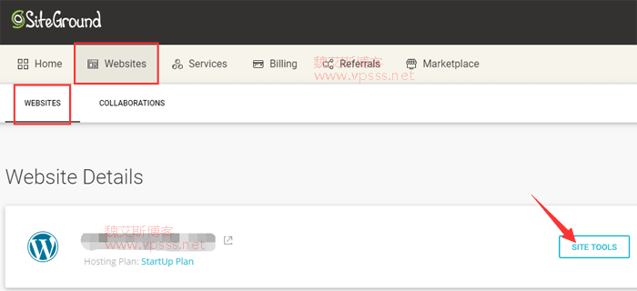 1、打开 siteground网站,从【websites】进入后点击域名右侧的【site tools】