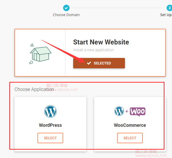 二、点击 【start new website】,下面出现两个程序供你选择,如果打算自己用模板建站就选择 wordpress;如果打算用 woocommerce 搭建商城就选择右侧的。
