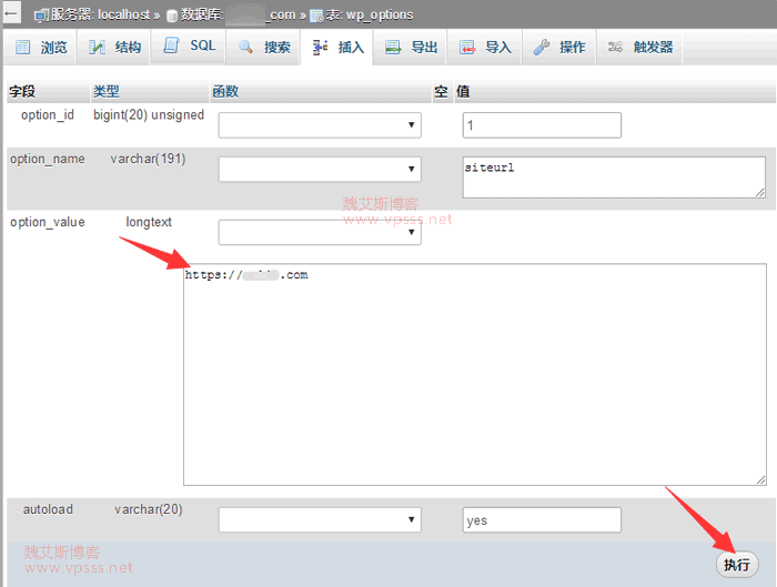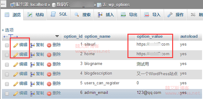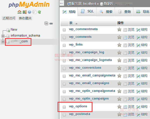 进入 phpMyAdmin 找到当前网站的数据库,右侧点击“wp_options”