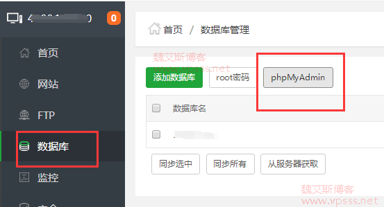 登陆宝塔面板,点击 数据库 > phpMyAdmin