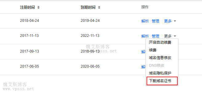 在待下载域名证书的域名行中,点击【更多】,选择【下载域名证书】。如需打印证书,请单击【打印证书】即可。