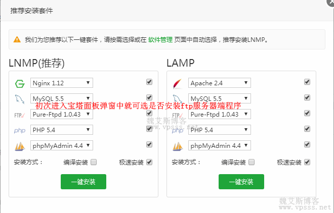 在刚部署好宝塔面板后,进入面板后会弹出提示框,提供安装 lnmp或者 lamp环境的选项,这里面就有 pure-ftp服务器端可选是否安装。默认勾选,安装之后可以添加 ftp账号,再分发给用户使用。