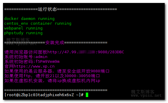 安装过程就不截图了,2分钟左右安装完成,看到紫色的面板访问地址,初始账号和初始密码,要复制到本地电脑中保存下来,留用。
