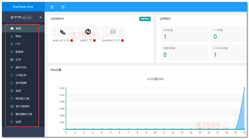主要操作功能集中在左侧了。依次是:网站、FTP、数据库、文件、操作日志、计划任务、软件管理、监控、网站防火墙、防火墙报表、服务器防火墙、设置。
