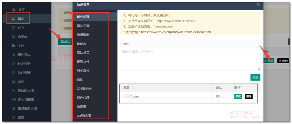 网站:用来添加网站点用的。默认域名是 localhost,可以修改成你的目标域名。其他的重要选项:流量限制、伪静态、配置文件、php版本、SSL、301重定向、防盗链、waf防火墙等都是很容易设置的。