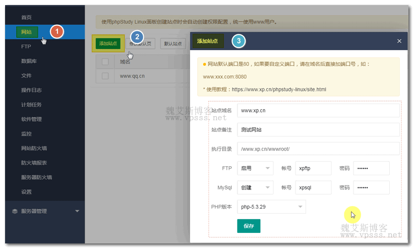 在小皮面板后台,网站 >> 添加站点 >> 输入域名,备注,选择 ftp、mysql、php之后就可以启用了。