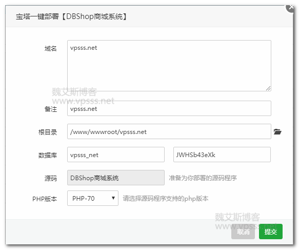 输入已经绑定到服务器上的域名,宝塔面板会自动创建根目录、数据库,PHP 版本选择 7.0以上 。