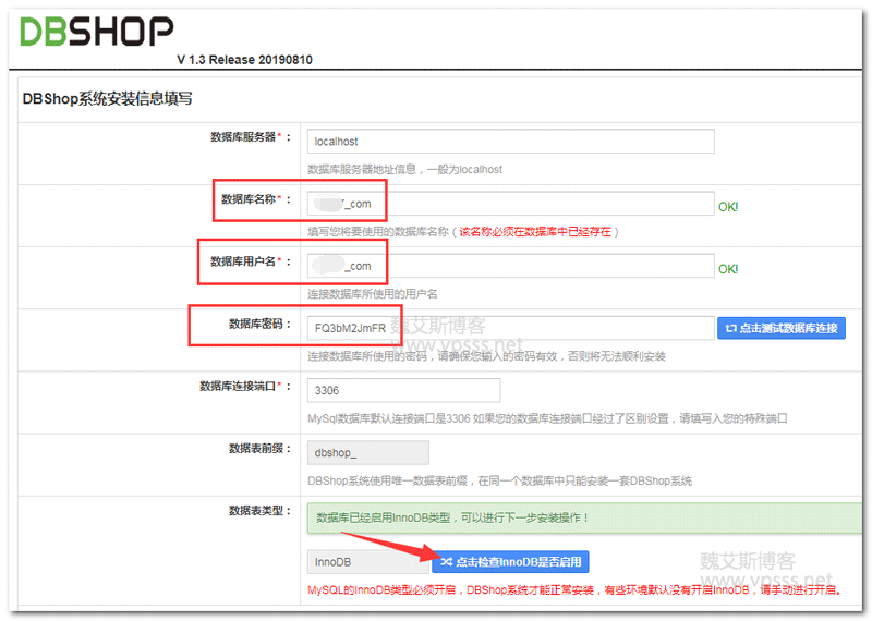 记得点击蓝色按钮,检查数据库是否已经启用InnoDB类型;