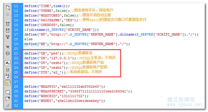 主要是数据库名、用户名、密码这三行与上面创建的网站数据库信息要相同。