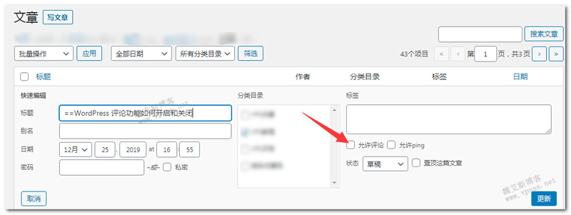 当你开启整站评论后,这时候去后台文章列表,选择任何一篇文章,点击“快速编辑”。如下图所示,可以单独设置每篇文章是否“允许评论”。