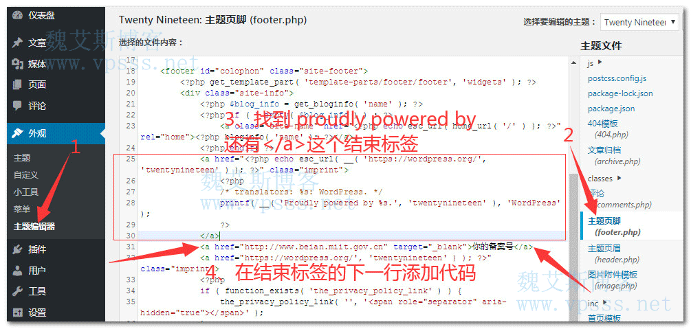 2、以默认的Twenty Nineteen主题为例,在右侧找到“主题页脚footer.php”文件,这里可以在线编辑,也可以用 ftp下载到本地编辑好后,再上传覆盖。